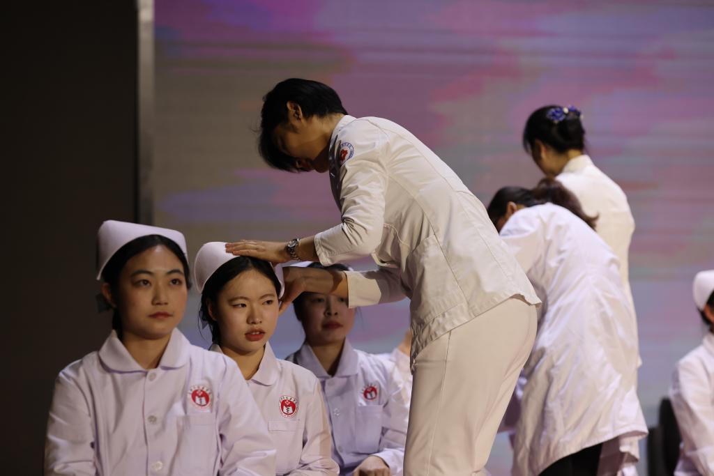 传光授帽仪式上,来自各附属医院的嘉宾为即将走上实习岗位的护理学专业学生戴上圣洁的燕尾帽;同学们接过象征着南丁格尔精神的蜡烛灯,并庄严宣誓,将不负前辈的期盼与嘱托,肩负白衣天使的责任与使命,将毕生精力奉献给护理事业。