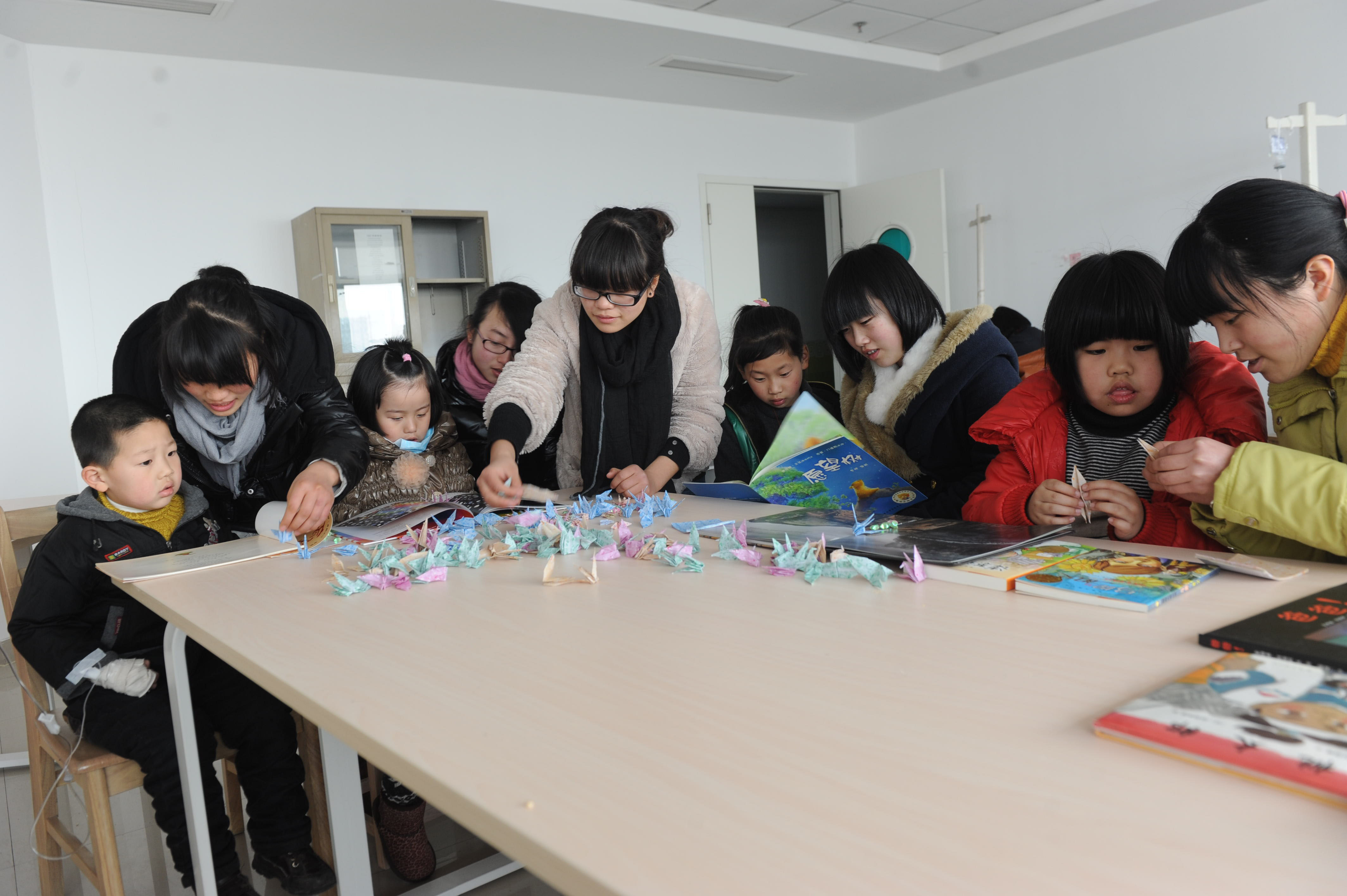 在家长的带领下,小病人们和学生围成圆桌,手把手教小病人折风车,带领小病人看故事绘本。家长也积极参与其中,整个活动共持续了两个小时,此时的示教室就像一个大家庭,没有哭闹与病痛,只有欢声笑语,其乐融融。