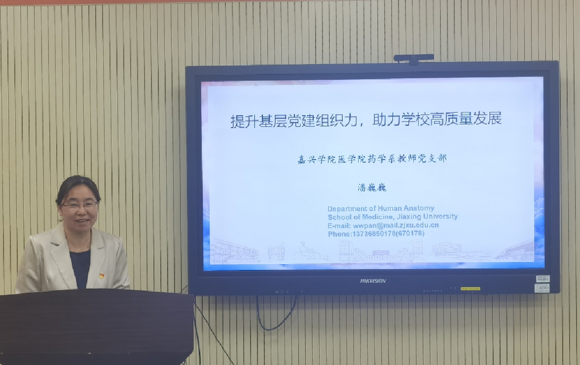 会上,潘巍巍以“提升基层党建组织力,助力学校高质量发展”为题,从教师党支部建设的现实困境、加强“双带头人”培育工程在基层党组织建设和发展中的必要性、药学系教师党支部基层党建创新与实践探索等方面介绍了我院药学系教师党支部开展“党建+N”创新工作方法如何助力专业建设、学科发展,高质量提升药学人才培养质量的经验。