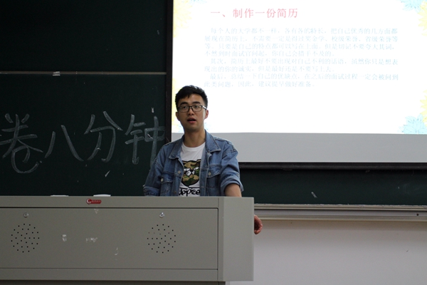 莫龙飞学长现在中美华东杭州部就职,他向我们分享了求职经验,主要从简历制作,参加校园招聘会投简历给心仪单位、收到通知,准备面试、实习等方面展开,鼓励大家早作打算,早作准备。