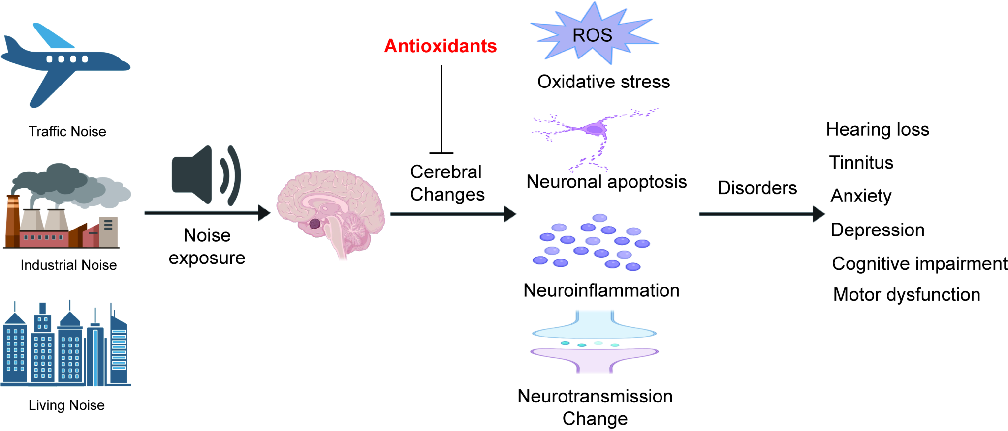 噪音是一种公认的健康风险,也是环境暴露的重要组成部分。随着现代化社会的发展,噪声污染已成为一个不可避免的且日益严重的公共环境问题。噪声暴露对中枢神经系统的影响是神经生物学团队的一个重要研究方向。团队成员曾宪思副教授、贾金婧副教授和李丽教授非常重视学生的科研思维和科研能力的训练,指导本科生聚焦噪声暴露研究前沿、收集文献并进行分类总结,综述了长期噪声暴露对脑组织的影响。噪声暴露可以诱导多个脑区发生氧化应激、神经元凋亡、神经炎症以及神经递质代谢改变,进而导致听力损失、耳鸣、焦虑、抑郁、认知损伤和运动障碍等疾病。团队进一步指出,白藜芦醇、维生素C和姜黄素等化合物具有抑制噪声暴露诱导的脑改变的功能。原文链接://www.sciencedirect.com/science/article/pii/S0147651324014878?via%3Dihub本研究得到了国家自然科学基金、漫蛙漫画 SRT等项目的支持。