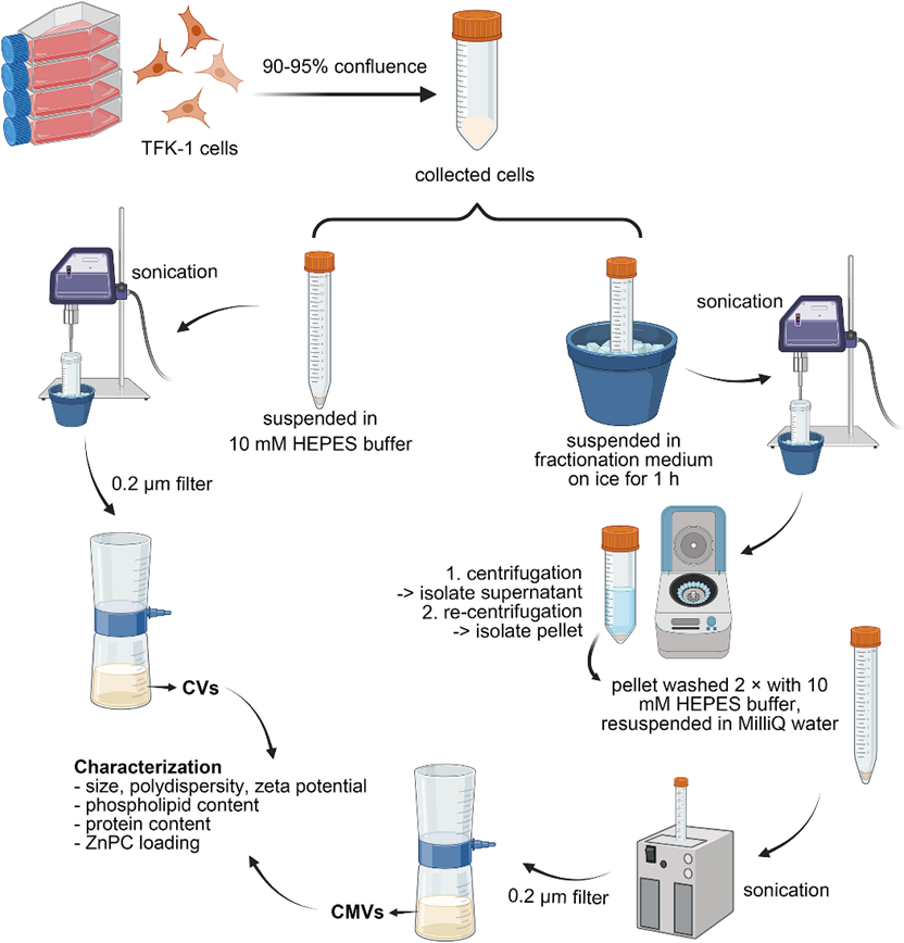 该论文为同类首创的概念验证研究,探讨了生物纳米囊泡(bionanovesicles)在胆管癌细胞(TFK-1)中递送光敏剂,并结合光动力疗法(PDT)进行治疗的应用。研究制备了两种生物纳米囊泡:细胞囊泡(CVs)通过超声介导的TFK-1细胞纳米化制备,而细胞膜囊泡(CMVs)则通过分离TFK-1细胞及细胞器膜后,经超声纳米化技术制备。两种囊泡均负载锌酞菁(ZnPC),随后对其进行了多参数表征并检测了肿瘤细胞关联性与摄取。结果发现,CVs和CMVs构成了一种无内在细胞毒性的高效光敏剂递送平台,其体外光动力疗效尤为突出。