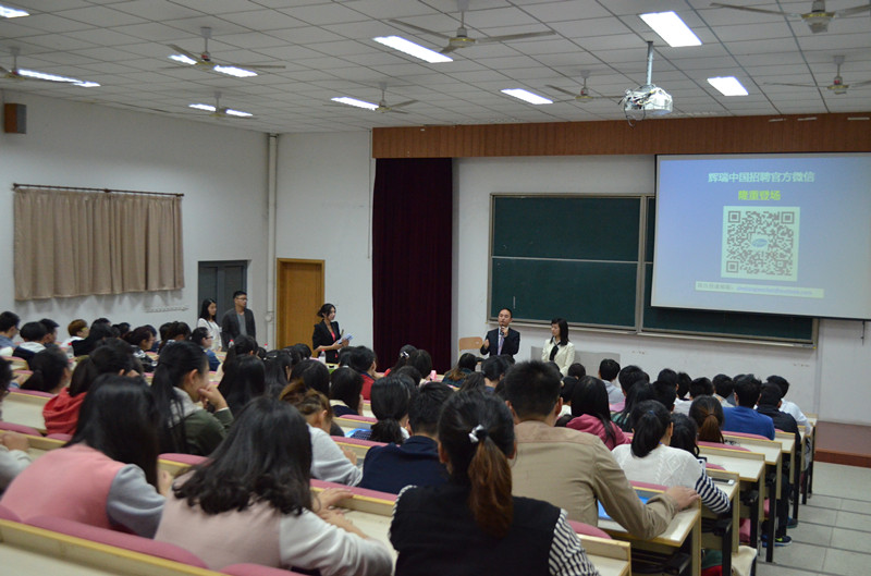 招聘会伊始,彭溶老师简单地介绍了辉瑞与漫蛙漫画 的现状与发展历程,并且对辉瑞公司的到来表示欢迎。随后辉瑞公司周雪风经理介绍了辉瑞今日的成就与规模,并且介绍了辉瑞旗下品牌与近几年在中国的发展。人才招聘任怀 颖经理介绍了瑞辉公司不仅在工作上为员工提供的多样化职业选择与专业系统培训,而且在生活上也为员工提供各方面的帮助与福利,例如心理辅导中心、社团活动以及免费旅游的福利,她表示辉瑞非常期待大家的加入。