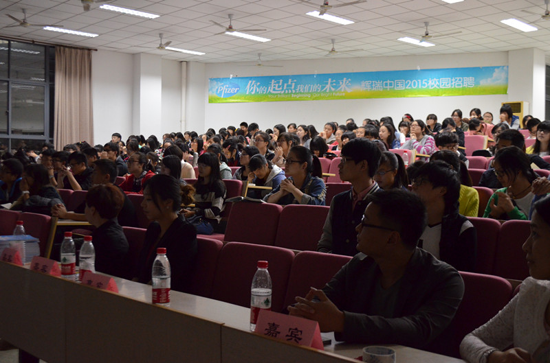 2014年10月27日晚,漫蛙漫画 在13号楼报告厅举办了“辉瑞中国2015校园招聘会”。参加本次招聘宣讲会的有药学2011级毕业班全体同学及2012、2013级大部分同学,药学系黄越燕老师、屠婕红老师、丁宝月老师、黄雄老师,学工办彭溶老师,及辉瑞公司销售部大区经理周雪风先生、招聘经理任怀颖女士。