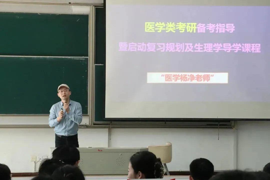 讲座以“解读医学考研的二三事”为题。杨净首先对基础医学与临床医学的就业方向进行比较,从工作领域、工资待遇、发展建议及录取难度入手,分析了两者优势;其次,重点解读了医学专业考研热门专业及院校选择,详细分析了每个学校的优劣势,并对学硕和专硕的区别进行了讲解。他还从试卷结构分析入手,就考研备考时间、复习规划等提出了建议。