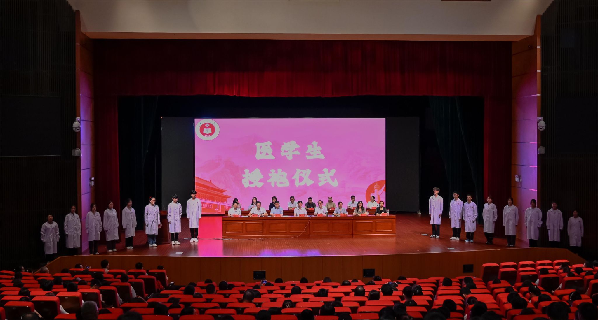 典礼上,学院还为新生举行了授袍仪式。16位新生代表依次上台,主席台就座的领导和老师们为新生授予白袍,并帮助新生整理仪表。对于新入学的医学生来说,这是一个重要的里程碑,授袍仪式标志着医学生涯的正式启航。最后,典礼在全体医学生庄严宣誓的“医学生誓言”中圆满落下帷幕。