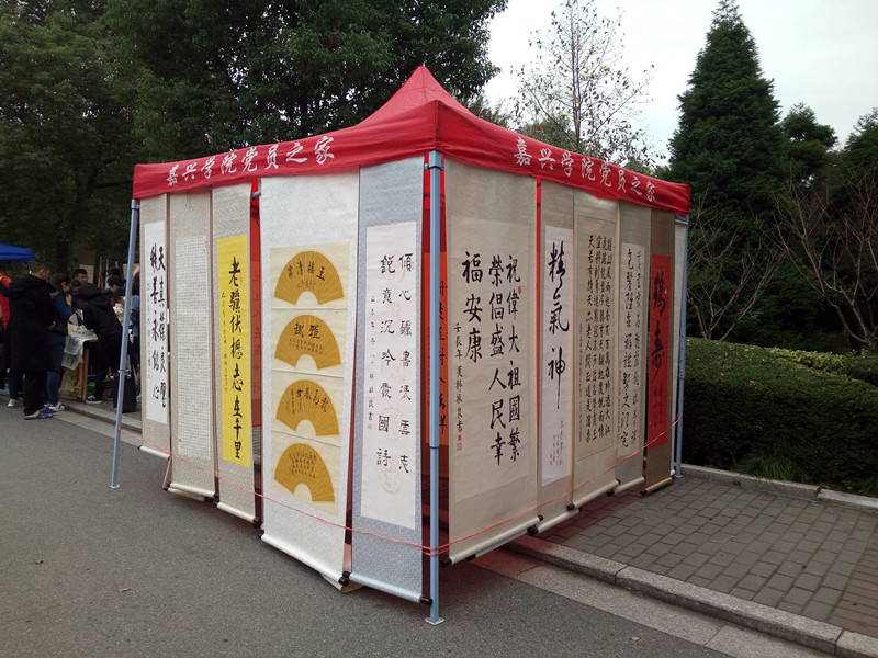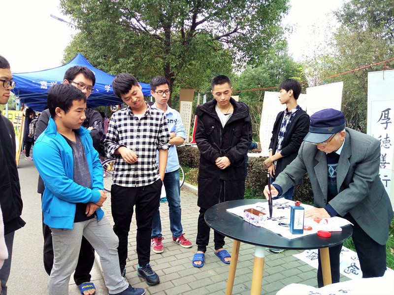 早在上午八点多,韩老就已经来到嘉兴学院,亲临书画协会义卖活动现场,活动现场展示了数十幅韩先生的书画作品。在中午11点左右义卖正式开始,来欣赏书画作品的同学也逐渐增多,不少同学借义卖的机会收藏了韩先生的书画。