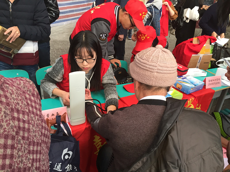的特色,他们结合自身的专业,为大家量血压,还做了急救知识和防艾知识的宣传,受到了同学们的一致好评,活动现场十分气氛热烈。在校外活动中,志愿者们更是热情高涨。他们在城南花园、华庭街中心广场和府南花园都积极开展了量血压,老人们相关健康知识的宣讲等活动。贴心的关怀和良好的态度让志愿者们赢得了人们的信任,他们离开时那些真挚的道谢也让我们感到无比满足。