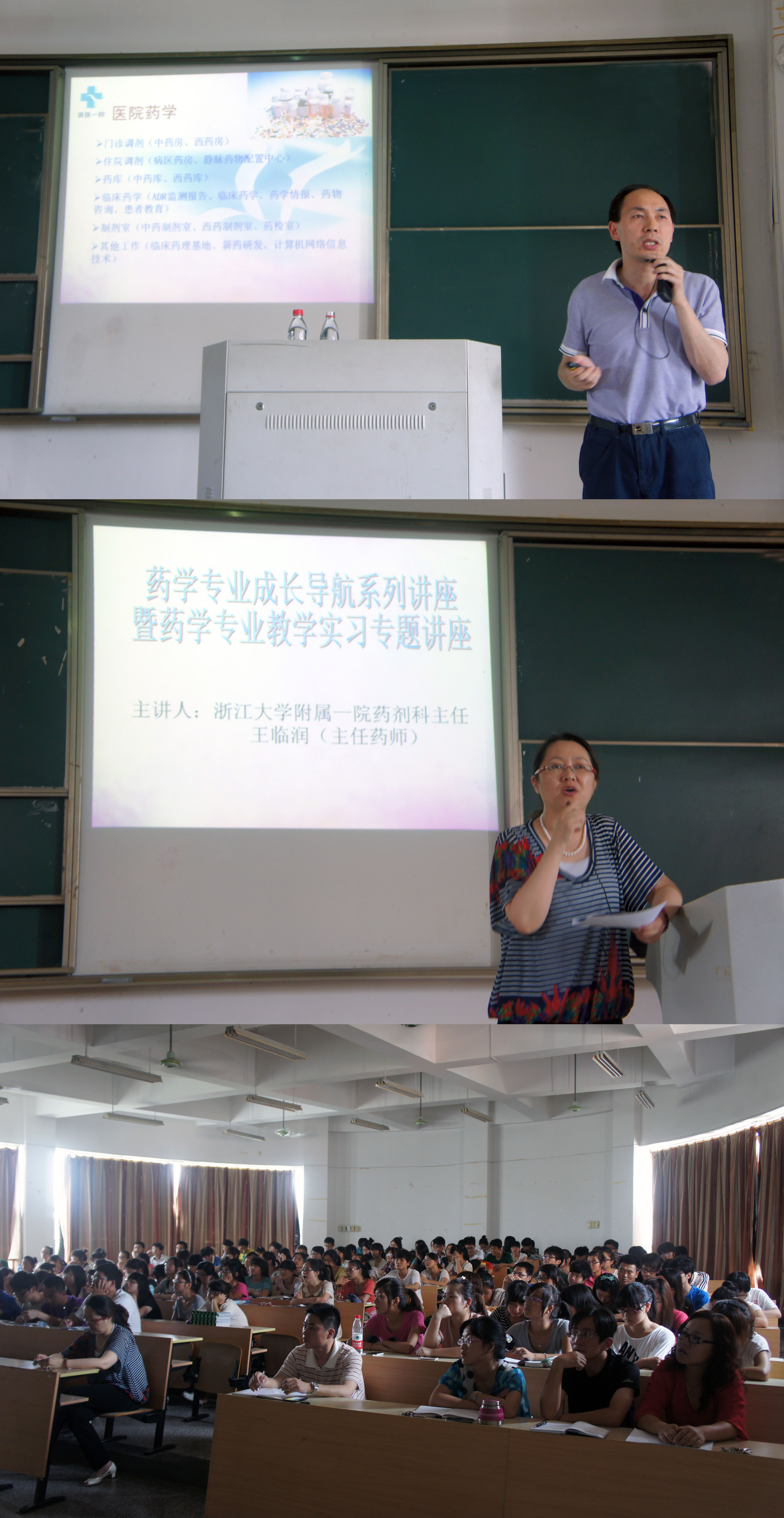 6月14日下午,药学专业在1-221教室举行了“专业成长导航系列讲座暨短学期教学实习专题报告会”。特邀浙江大学漫蛙漫画 附属第一医院王临润主任作“全程化医院药学服务”专题报告,药学专业部分老师和全体同学参加了本次讲座,黄嬛副院长主持报告会。 王主任的报告向大家展示了医院药学中一个医药协作、医药与患者互动的全新局面。随着“全程化药学服务”理念的推进,药师参与临床用药、治疗药物检测、药学信息服务、药物不良反应监测、全方位、多层次开展用药教育等等实践。报告图文并茂,深入浅出,让同学更加明确通过本科学习之后,在医院药学领域可开展工作的方向。 本次报告会是“药学专业成长导航”系列讲座的第三讲,学院将有计划地邀请行业专家、教授选择多个方向开展好后续讲座,给予学生更加系统的专业成长导航。