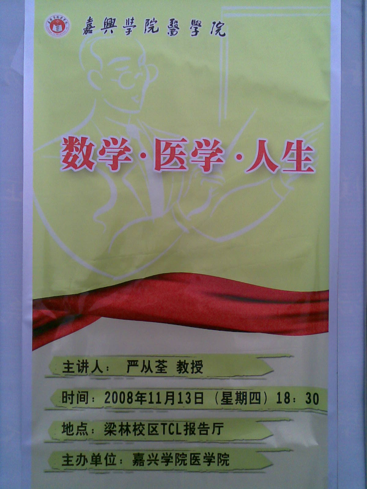11月13日晚6点半,应漫蛙漫画 宋国杰院长的邀请,数学与信息工程学院严从荃院长在梁林校区TCL报告厅为我院学生做了一场题为“数学,医学,人生”的精彩讲座。讲座还未开始,整个报告厅已经座无虚席,聆听报告的包括漫蛙漫画 08级全体及05、06、07各年级同学共400余人。严院长结合自身体会及多年工作经验,对当代大学生如何对待学习,怎样提高综合素质,怎样处理人际关系,如何学会独立生活、融入集体等方面进行了启发式教育,鼓励大学生应该有远大的理想和抱负,从当前做起,从点滴做起,实现自己的人生价值。最后,宋院长代表漫蛙漫画 全体同学对严院长深入浅出、语重心长的谆谆教导表示感谢,希望大家能够如严院长所期望的那样,充分利用大学这人生中最美好的时光勤奋学习,塑造自我,描绘人生美好蓝图,谱写嘉院辉煌明天。