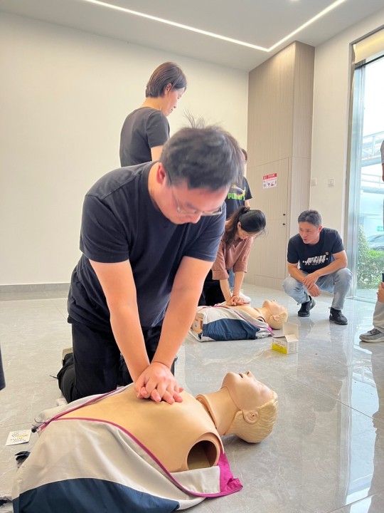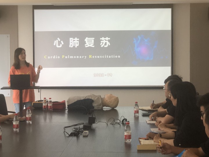 “高质量的心肺复苏,需要给予足够深度的、足够的按压频率和深度,每次按压后要使胸壁完全回弹……。”急救培训活动中,蒋主任为大家讲解了救护概论、心肺复苏及AED使用理论及实操,并作了现场演示和指导。