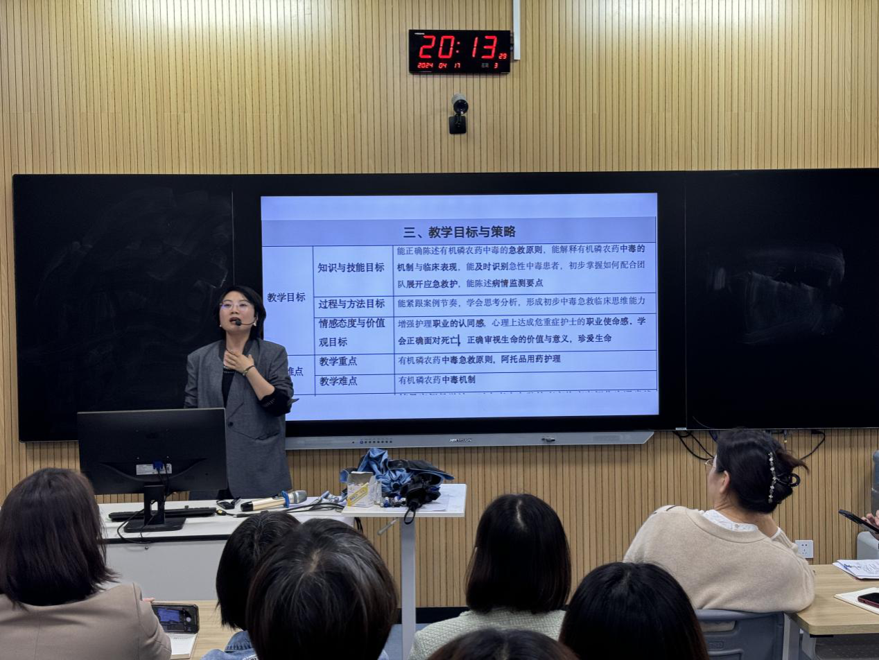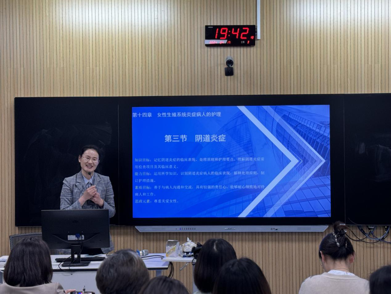 雷璇老师以“大肠癌患者的护理”为题,介绍了线上线下混合式教学的特点,分享了如何利用游戏、弹幕、头脑风暴等环节提高学生课堂参与兴趣。王艳萍老师以“上消化道出血”为题,从宏观上与大家探讨根据课程特点、学情分析找到适宜的教学设计方案;从微观上以一次课为例,分享“案例贯穿”、“问题引导”、“温故知新”及“课程思政”设计。谢晓云老师立足妇产科护理学,以“阴道炎症”为例,以任务单形式整合教学内容,探讨如何以任务表单贯穿多而杂的教学知识点设计,同时以3张PPT的内容进行教学实景展示。周丹老师以急诊中毒案例进行课程导入,以三维动画、视频案例等多媒体形式突破课程难点,将知识点有效融入,教学过程生动活泼引发思考,思政内容自然融入引起共鸣。