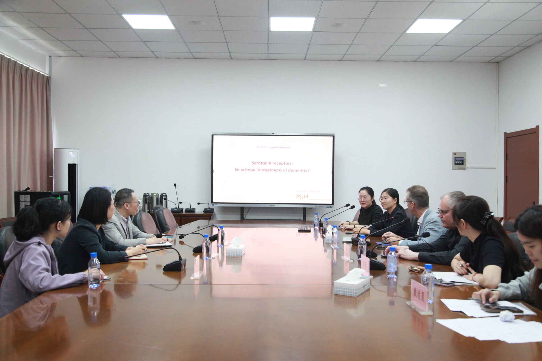 及其个人基本情况,并作了题为“血清素受体:治疗痴呆的新希望?”的报告。深入探讨了血清素受体与痴呆之间的密切联系,提出使用阿米舒必利作为一种治疗痴呆的新治疗方式。同时,Evgeni Ponimaskin教授根据合作需求,针对拟开展的痴呆相关的临床研究合作,提出了一系列关键问题。