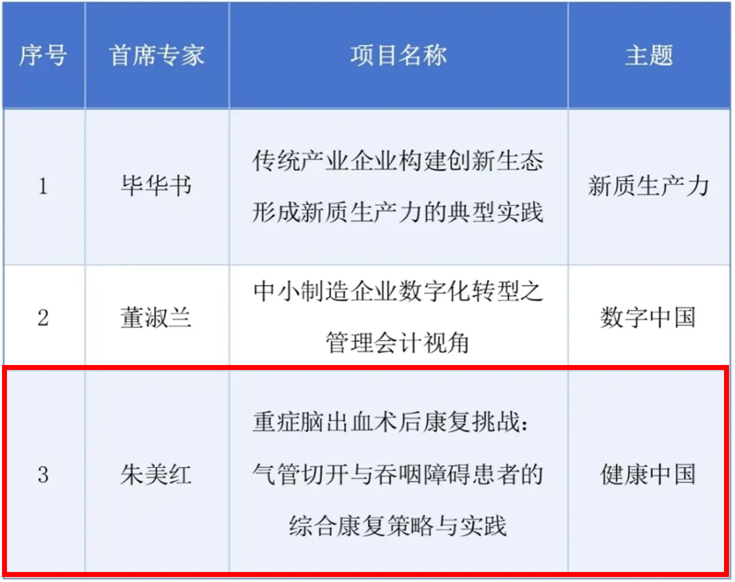 共有3个项目入选,涵盖“新质生产力”“数字中国”“健康中国”三大主题。其中我院护理学专业研究生导师朱美红老师主题案例《重症脑出血术后康复挑战:气管切开与吞咽障碍患者的综合康复策略与实践》成功入选“健康中国”方向。