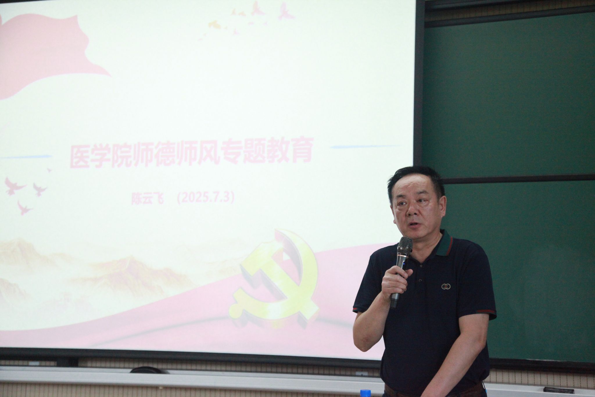 陈云飞结合《新时代高校教师职业行为十项准则》,详细解读了教师在政治方向、爱国守法、教书育人、学术规范、廉洁自律等十个方面的职业行为规范,深入剖析了学术不端、违规收费、师生关系不当等问题的严重危害。针对当前师德师风建设中的突出问题,对违规吃喝和收受礼品礼金两大重点领域,通过"案例剖析+政策解读"的方式,重点剖析了7类违规吃喝情形和6类违规收送礼品礼金行为的具体表现和认定标准,为全体教职工划清“行为红线”。