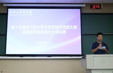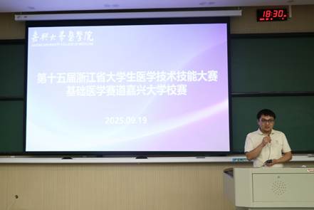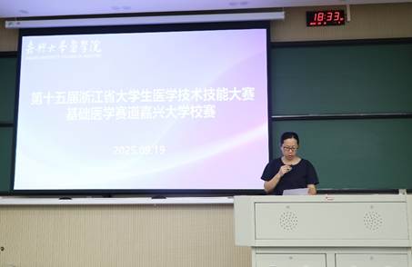 基础医学部夏满莉副教授作为比赛考核老师代表宣读校赛的纪律,希望所有参赛队员均能严格遵守校赛纪律进行比赛。